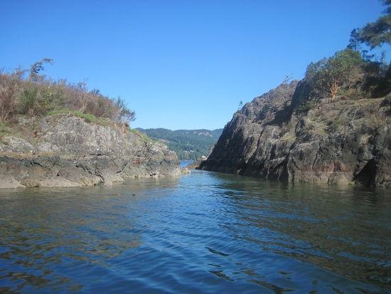 Da ich gut vorangekommen bin, mache ich noch einen Abstecher in die Anderson Cove. Diese Bucht ist nur durch eine schmale Zufahrt zwischen Felsen zu erreichen. Bei der Ausfahrt aus der Bucht weht mir ein mittelkräftiger Wind entgegen, auch die Wellen werden jetzt höher. Der Rückweg ist nicht mehr weit, es geht wie am Vortag in die schmale Durchfahrt zwischen den Goodrich Islands.