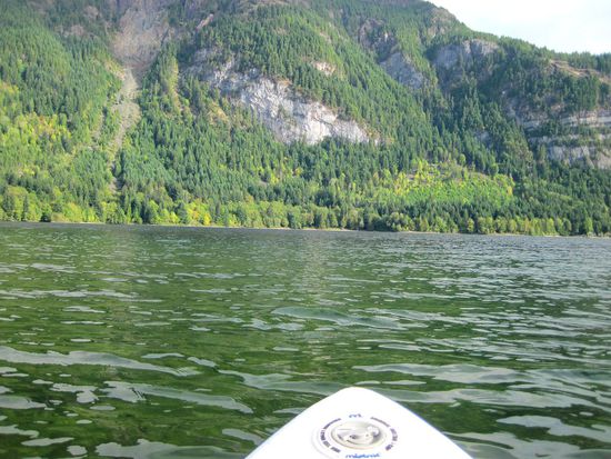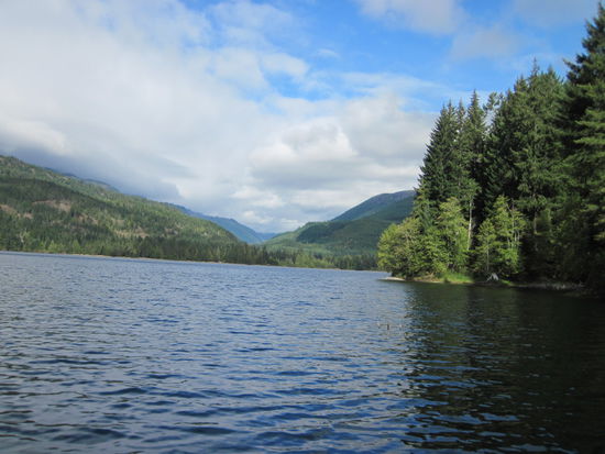 Heute fahre ich zum Horne Lake nördlich von Parksville. Die Zufahrt auf einer unbefestigten Forststraße zieht sich etwas in die Länge. Einen Seezugang gibt es erst fast am Ende des Sees an einem Regionalpark. In diesem hinteren Teil des Sees hält sich der Wind in Grenzen, so dass ich etwa drei Stunden mit der Erkundung des Sees zubringe.