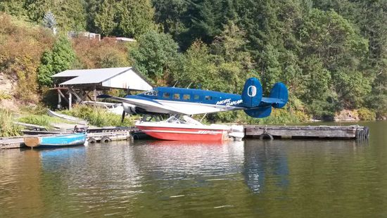 Das mit den Flugzeugen wäre mir auf einem Paddelboard auch nicht angenehm. Außerdem ist an der Küste wieder viel Wind angesagt, so dass ich mir einen Binnensee zum Paddeln ausgesucht habe. Auf der Karte sieht der Quennel Lake südlich von Nanaimo sehr interessant aus, er hat viele Seearme und Inseln. Es gibt nur einen öffentlichen Zugang an der Ridden Road, der ist aber gut zu finden. Als ich in einen der vielen Arme des Sees einbiege, wundere ich mich schon, wer hier ein Flugzeug in diese abgelegene Wildnis gebracht hat. Beim näher kommen wird aber klar, dass dies ein sehr rustikaler "Airport" ist. Solche Stützpunkte für Wasserflugzeuge werden hier "Aerodrom" genannt.