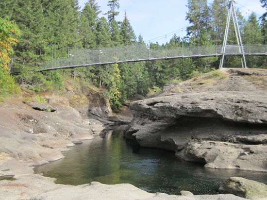 Am Vormittag geht es ohne Auto gleich zu Fuß auf einem Wanderweg entlang des Englishman River zum Top Bridge Park. Dort schließt sich dann ein Rundweg an.
