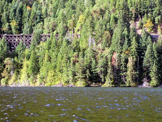 Am späten Nachmittag geht es nochmal kurz an den Cameron Lake. Hier treffe ich einen Einheimischen, der gerade sein Paddelboard auf dem Auto verstaut und wir kommen kurz ins Gespräch. Die Runde auf dem See führt mich diesmal am Nordufer entlang. Da kann man die Reste der Bahnlinie nach Port Alberni bewundern, vor allem die Brücken aus Holzfachwerk.