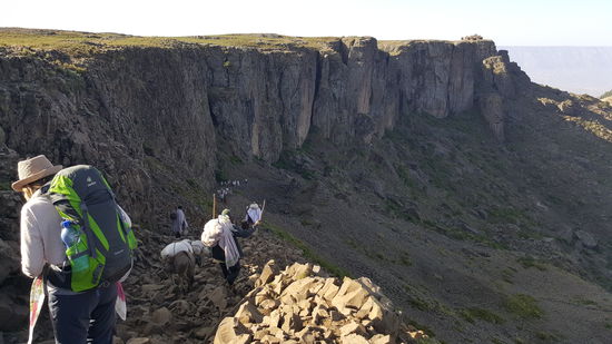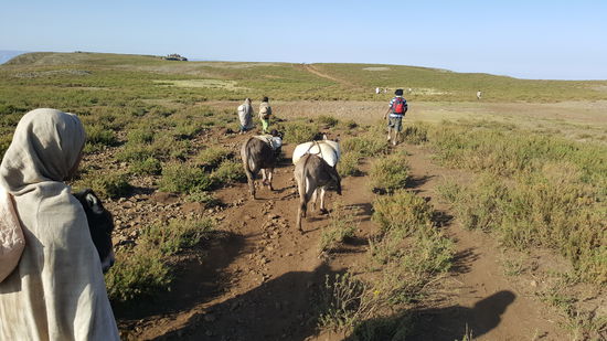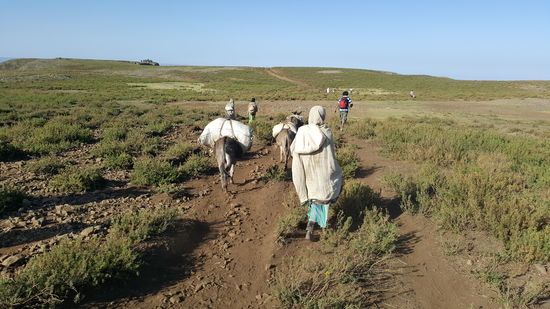 Heute ist Samstag und Markttag in Lalibela. Daher kann man weit über die Hochebene sehen, wie die Bauern ihre Ware auf dem Rücken oder mit dem Esel runter zum Markt bringen. Es ist wie eine Karawane.