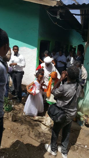 Wir gehen zwischendurch zur zweiten Hochzeit. Wieder geben wir am Eingang das Geldgeschenk ab, Essen und trinken. Das Injera mit Fleisch ist hier nicht besonders lecker. Aber da müssen wir durch, wir wollen ja nicht unhöflich sein.