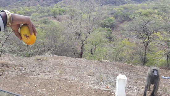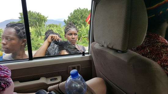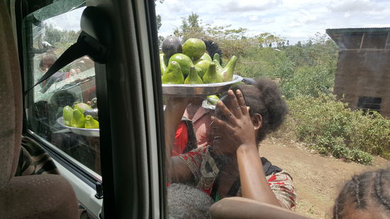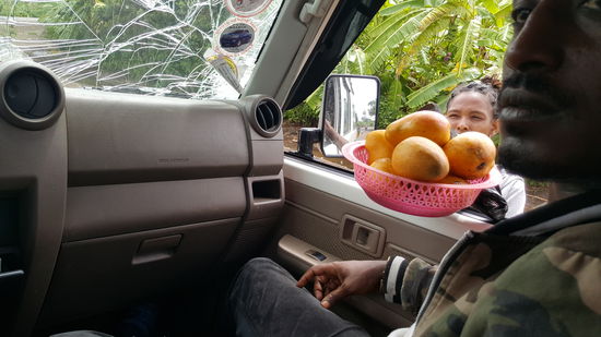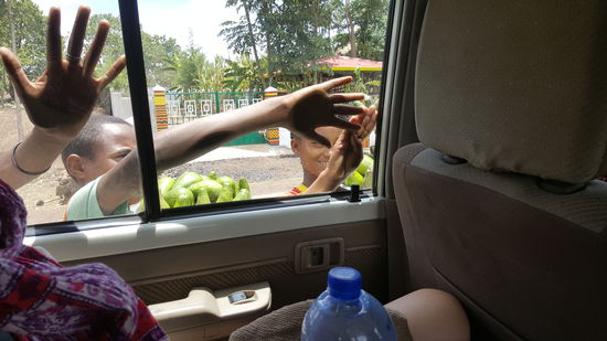 Zwischendurch halten wir an, wir wollen u.a Mango kaufen. Kaum steht das Auto drängen viel Jungen und Mädchen mit Schalen voller Früchte ans Auto. Jonas und Joannes öffnen das Fenster und schon eht das Feilschen los. Jeder will etwas verkaufen und so wandern die Blicke auch zu uns.