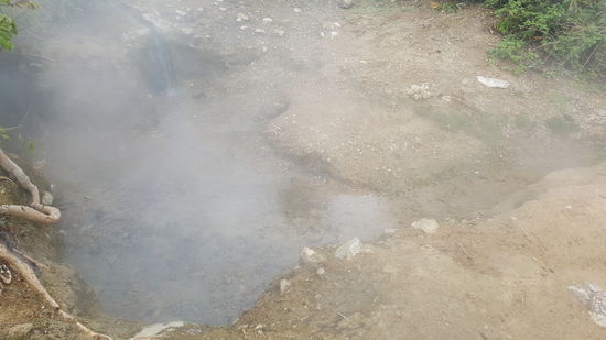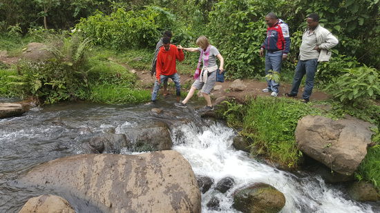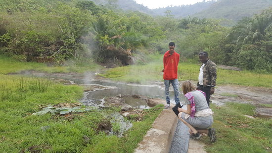 Bei den heißen Quellen angekommen, gibt es mal wieder einen lokalen Guide. Mit ihm gehen wir durch den Wald zu den heißen Quellen. Wir müssen auch einen Bach überqueren, nicht so einfach.