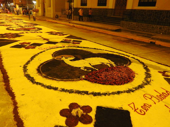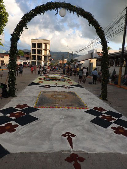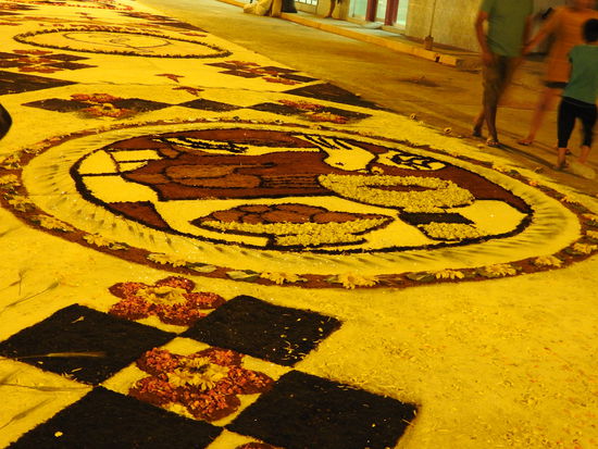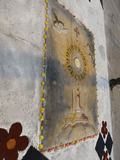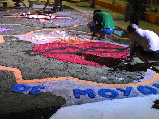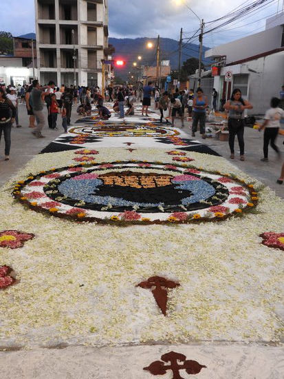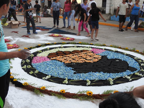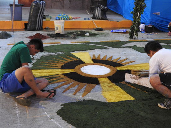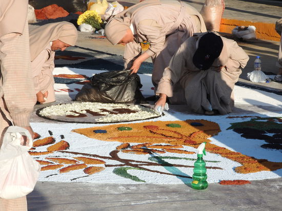 Am Sonntag dann war ab dem Nachmittag die halbe Stadt rund um die Plaza und den Park damit beschäftigt die schönsten Bilder aus Blumen und verschiedenfarbiger Erde für die Prozession am Abend zu gestalten. Selbst während dem Gottesdienst am Abend arbeiteten die letzten noch an ihren Werken. Am Ende waren die kompletten 200m rundum ein einziger Bilderteppich.