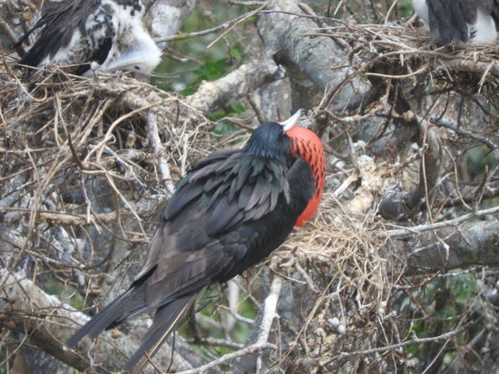 Ein balzender Fregattvogelmann, er ist an seinem roten aufgeblasenen Kropf auch über weite Strecken gut erkennbar