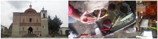 Mitla. Neben kleineren Ruinen der Zapotecen steht in Mitla eine größere Kiche und es gibt sehr viele Touristenläden (Waren aus Stoff, Holz, Ton, usw.). Uns bleibt der Ort jedoch für die Erklärung in Erinnerung wie die Farben für die Stoffe auf natürlichem Weg hergestellt werden. Inklusive Demonstration: