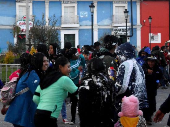 Am Abend steht eine kleine Stadtbesichtigung auf dem Plan. Wir merken: Es ist der letzte Tag vom Carnaval. Der in den bis dato bereisten Ländern essentielle Partyschaum gehört auch in Peru zur Grundausstattung: