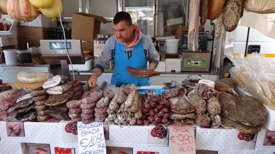 Diesen Mittwoch hatten wir für einen Besuch des kleinen Städtchens Arzachena eingeplant, nicht zuletzt deswegen, weil an diesem Tag auch der Wochenmarkt stattfindet. An den verschiedenen Ständen werden regionale Spezialitäten angeboten - Probierteller mit Wurstscheiben oder Käsehäppchen stehen bereit.