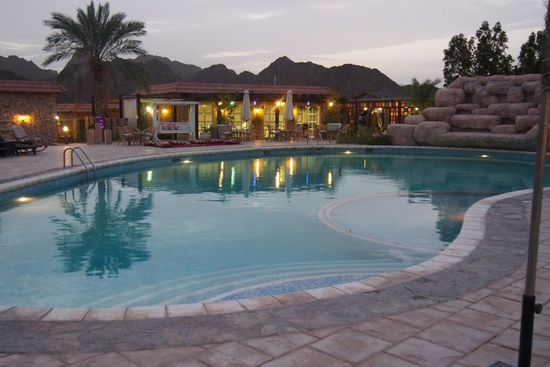 Von Nizwa aus an Al Ain vorbei, waren es ca.300 km durch die Wüste . Unterwegs ein wenig Sandsturm. Nach den 30 Grad der letzten Tage fiel das Thermoneter auf 19 Grad. Und beim Erreichen des Ziel, fernab der Zivilisation, ein langes Gesicht: das soll in der kargen Landschaft die tolle Anlage sein? Nun gut, machen wir das Beste daraus.