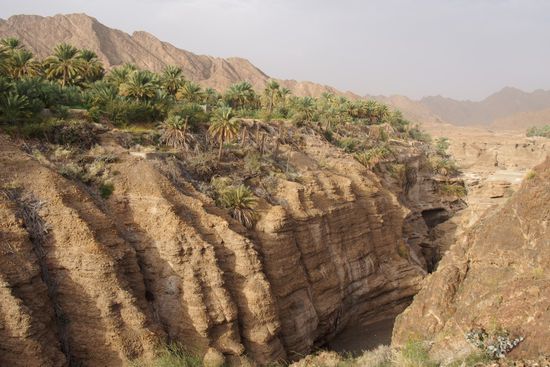 Wer stellt sich Oman so vor? Das Wadi führt ganzjährig Wasser und mit ausgeklügelten Bewässerungssystemen wird kleinteilige Landwirtschaft ermöglicht.
