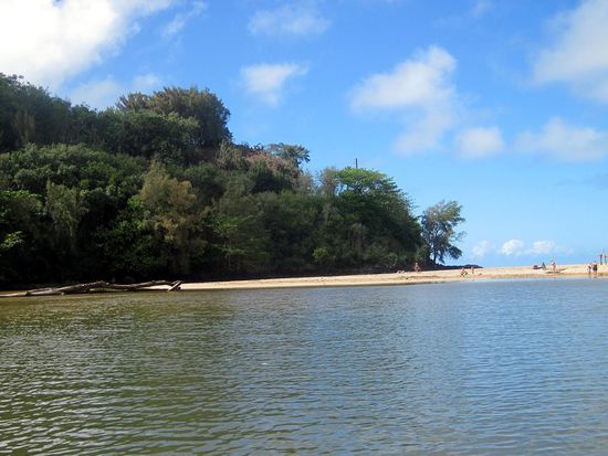 Das Bild zeigt die ruhige Lagune hinter dem Kalihiwai Beach.