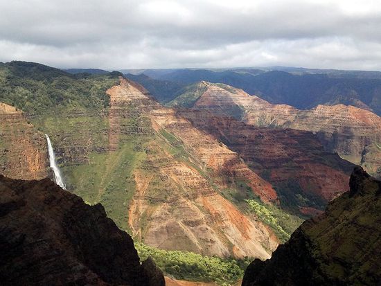 Nochmal geht es zeitig in den Waimea Canyon, diesmal aber bis hoch zum Ende der Straße am Puu o Kila Lookout. Im Canyon regnet es mal mehr, mal weniger. Trotzdem beginne ich den Pihea-Trail. Der ist bei den herrschenden Wetterverhältnissen nicht ganz einfach zu gehen. Die Stufen in dem lehmartigen Boden bilden kleine Wasserfälle.