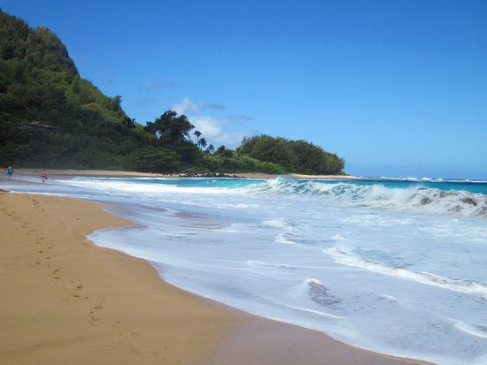 Heute ist ein Strandtag. Zuerst fahre ich zum Haena Beach. Dort ist bei den Rettungsschwimmern die rote Flagge gehisst, die Wellenhöhe ist 2..4 m. Ich laufe etwa 1 km am Strand entlang zum Tunnels Beach. Der hat ein Riff, hinter dem es etwas ruhiger ist, Die Wellenhöhe ist so, dass man gerade so noch schnorcheln kann. Weit hinaus schwimme ich aber nicht. Wenn viele Wellen über das Riff schlagen, kommen starke Strömungen zustande.