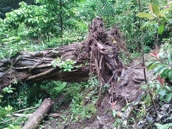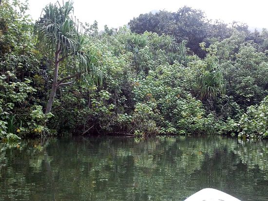 Der Weg ist stellenweise sehr morastig, bei den Flussdurchquerungen wird man wieder leidlich sauber. Außerdem gibt es Mücken, dagegen helfen aber lange Sachen und etwas Autan sehr zuverlässig. Am Nachmittag sehe ich mir das nochmal vom Fluss aus an und paddle von der Kahana Bay den Kahana River flussaufwärts, bis dichtes Geäst eine Umkehr nahelegt.