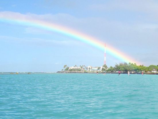 Das Wetter ist durchwachsen, ein kurzer Regen wird mit einem wunderschönen Regenbogen über Honolulu belohnt.