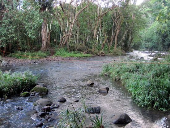 Der Weg ist nicht schwierig, es gibt einige Stellen mit Matsch. Die Flußquerung ist mit Seilen gesichert, das Wasser ist heute nur knietief.