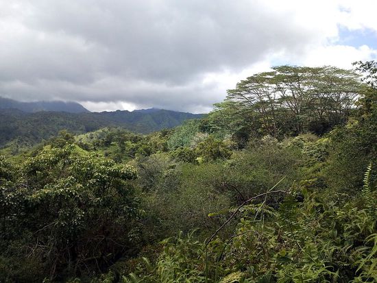 Am Nachmittag fahre ich zum Keahua Arboretum. Dort lasse ich das Auto vor der ersten Furt stehen und schaue erst mal zu, wie andere die Furt meistern. Da aber sogar ein Prius die Furt durchquert, muss ich wohl keine Bedenken haben. Ich gehe trotzdem zu Fuß los und wandere die ersten 3 km vom Powerline Trail. Nach einem steilen Anstieg folgt der einem Berggrat. Es gibt einige schöne Ausblicke nach beiden Seiten.