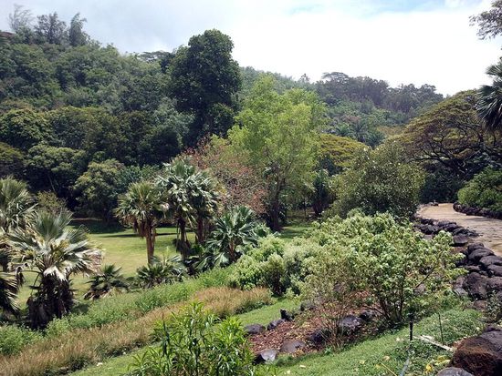 Einsetzender Regen vertreibt die meisten Strandgäste. Ich fahre zum Besucherzentrum der Botanischen Gärten und hole mir ein Ticket für den McBride Garten (den Allerton Garten kannte ich schon). Ein Bus bringt die Besucher dorthin auf dem Weg der früheren Zuckerrohr-Schmalspurbahn. Die Tour ist "self guided", man braucht etwa zwei Stunden.