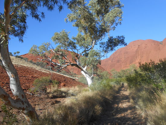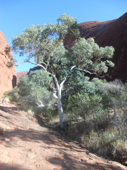 an ihre Grenzen. Erstmal spaziert man durch das Valley of the winds. Traumhaft schön, jedoch sehr sehr windig. Die ersten Felsformationen und Wüsten-Geröll ohne Ende nimmt man noch mit einem "wird schon noch besser werden" hin. Die schlechte Nachricht. Wüstenschutt und Geröll gibt es zu Hsuf in Kata Tjuta. Belohnt wird man jedoch mit sagenhaften Foto Motiven. Kata Tjuta ist der Wahnsinn. Überall schöne Eukalyptusbäume. Die blöde Frage sind das Birken wurde gelöst indem wir mal am den Blättern gerieben haben. Die Blätter haben die typischen Öle und duften nach Eukalyptus.