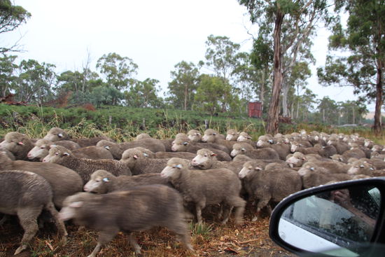 Einige km weiter eine "Straßensperre". Eine Schafherde auf der Reise - aber wohl ein wenig anders als geplant.
