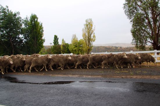 Die Straße gehört den Schafen. Während der Schäfer und sein Hund mit verkniffenen Gesichtern hinterherlaufen folgt die Herde ihrem Lei(d)t-Hammel. Wohl dem, der ein wenig Geduld im Gepäck hat.