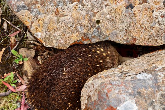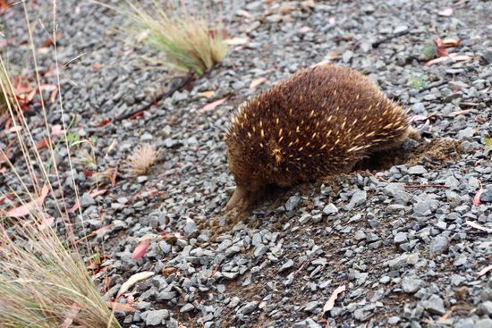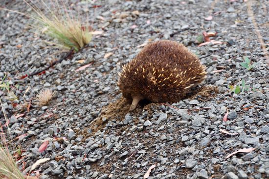 Etwas später eine weitere Sperre. Ein Ameisenigel mitten auf der Straße. Ob er Maut will? (Ameisenigel gehören zu den wenigen Beutel-Säugetieren, die Eier legen). Wir können zwar rechtzeitig bremsen, stehen aber ungünstig hinter einer Kurve.