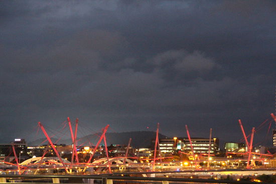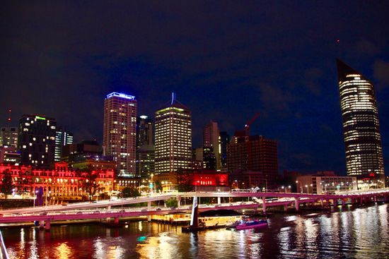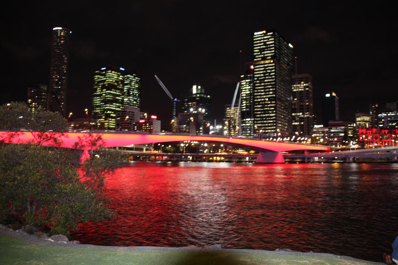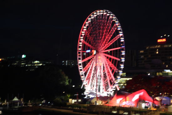 Wir kommen in die City und an der South Bank leuchtet die Stadt in rot. Selbst das Weel of Brisbane. Herausgeputzt im Rahmen eines Festivals. Beeindruckend!