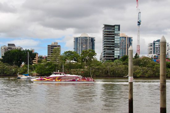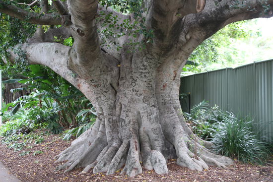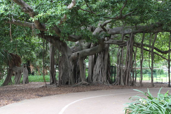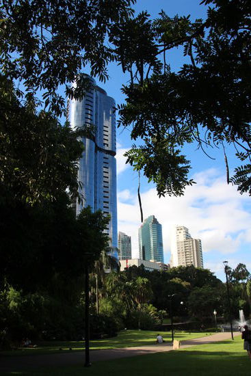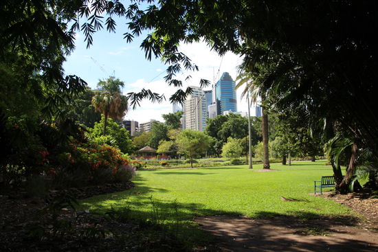 Soviel zur Stadt. Mitten in deren Centrum, direkt am Brisbane-River liegt der Botanic Gardens. Im städtischen Trubel ein Ort von Ruhe und Entspannung. Er wurde 1885 angelegt und war bis dahin der Gemüsegarten der Strafkolonie. Von den um 1850 angelegten Bunja-Bäumen sowie den um 1870 gepflanzten Ficus benjamina, die jeweils einen Weg säumten, haben bis heute einige Exemplare überlebt.