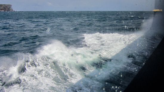 Auf ihrer Fahrt Richtung Manly lässt unsere Fähre dieses Tor zwar rechts (Hin-) bzw. links (Rückfahrt) liegen und bleibt im Hafengebiet, kommt aber je nach Wind, Wetter und Gezeiten schon ganz schön ins schaukeln. Zumindest bei dem Teil der Überfahrt, an dem es auf Höhe des "Tores" unmittelbar in den Strömungen liegt. Wir freuen uns drauf und fahren hin.