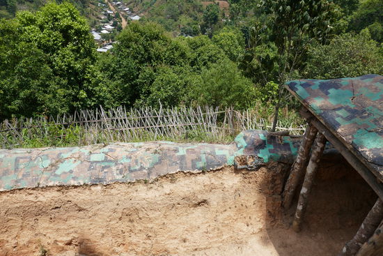 500 Meter nördlich ist der heutige Grenzübergang nach Myanmar, oberhalb des Schlagbaums kann man von den alten Schützengräben des Thai-Militärs auf das ärmliche Dorf Mae Aw Long schauen.