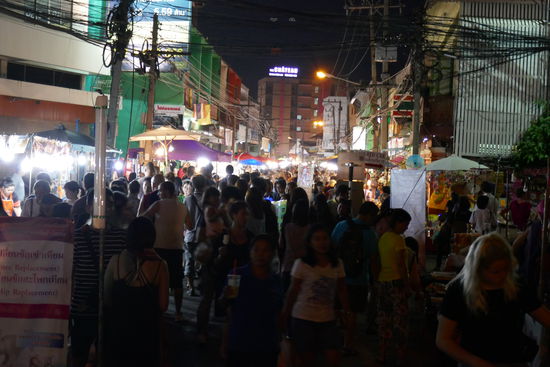 Es gibt einen großen Platz mit Tischen und außen herum stehen Essensstände. Es gibt alles was das Herz begehrt an Thaifood.
