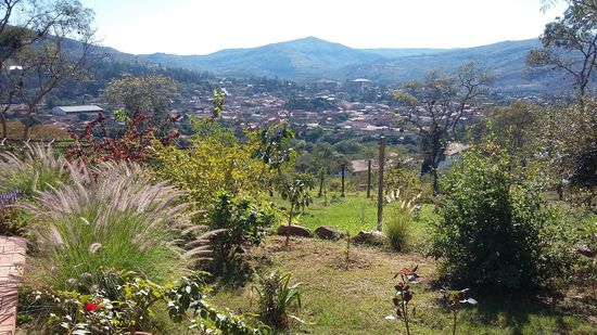 Die Strecke ist, je weiter man von Santa Cruz entfernt ist, umso abenteuerlicher. (In der Regenzeit würde ich hier nicht lang fahren wollen) Die Straße ist zwar asphaltiert, dennoch stellenweise komplett vom nassen Schlamm überdeckt. Der Taxifahrer fährt, als ob wir im Auto einen Notfall hätten, ich sitze vorne neben ihm und beobachte seine Fahrkünste. Aber ich vertraue ihm, er scheint die Strecke wie seine Westentasche zu kennen. Nach 2 Stunden und 40 Minuten sind wir da (überall lese ich 3 Stunden Fahrtzeit...). Zum Hostel muss ich 400 m einen steilen Hügel raufgehen, was mit dem gesamten Gepäck schon eine gewisse Herausforderung darstellt... doch oben werde ich mit einem phantastischen Blick über den Garten, die Stadt und die Berge belohnt.