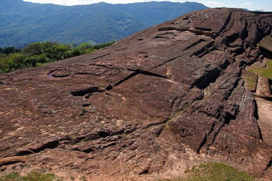 An der Plaza nehme ich ein Taxi, das mich zu dem 9 km vom Zentrum entfernten El Fuerte bringt. Der Eintritt kostet 50 Bolivianos. Durch die Anlage führt ein schöner Rundweg, auf dem ich immer wieder die schöne Landschaft genieße. Der große Sandsteinfelsen lässt sich prima von einem dafür angelegten Aussichtspunkt betrachten. Ich habe an diesem Tag wunderschönes Wetter, Sonnenschein pur, keine Wolken am Himmel und angenehme Temperatur. Super! Es sind einige Besucher hier, darunter auch viele Einheimische, denn es sind immer noch Winterferien und viele Cruceños verbringen ihre Ferien hier. Doch durch die Größe der Anlage ist diese nicht überlaufen.