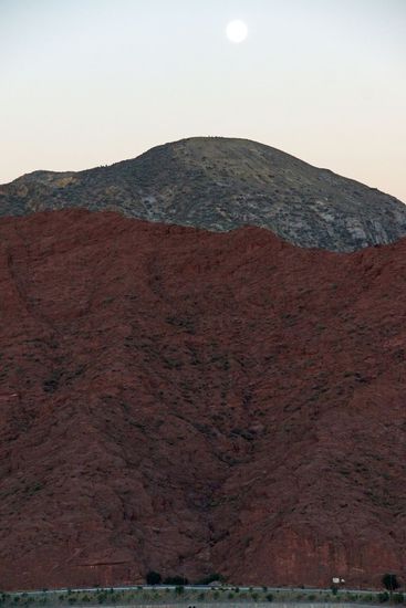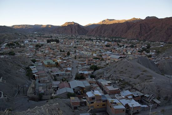 Am Abend suchen wir den Cerro, der in einer Karte eingezeichnet ist. Irgendwie gibt es hier aber jede Menge Hügel und auch wenn wir auf einen rauf gekrackselt sind, weiß ich nicht, ob es der in der Karte gekennzeichnete ist. Egal, die Sicht ist schön, in der mittlerweile untergehenden Sonne kann man von hier oben das kleine Städtchen Tupiza betrachten. Über den Bergen auf der anderen Seite des Flusses ist der Mond zu sehen.