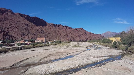 Frühstück gibt es im Hostal nicht und so gehen wir zum Markt und trinken zuerst einen Früchtesaft, selbstverständlich aus frischen Früchten zubereitet und anschließend das Quinua Getränk, das ich schon zu Beginn meiner Reise kennen lernte. Ist nicht ganz so lecker wie bei der Familie in Cusco zubereitet, aber gut. Später machen wir einen Spaziergang entlang des Flusses, vielleicht zutreffender gesagt entlang des Flussbettes, denn viel Wasser ist momentan nicht im Fluss. Die Sonne ist stark, hätte ich nicht gedacht.
