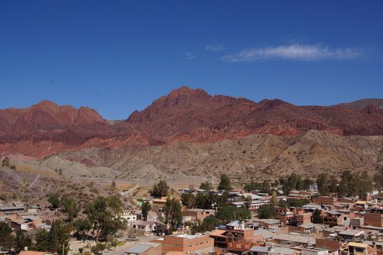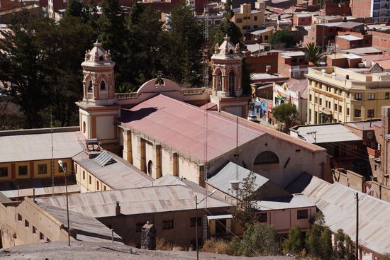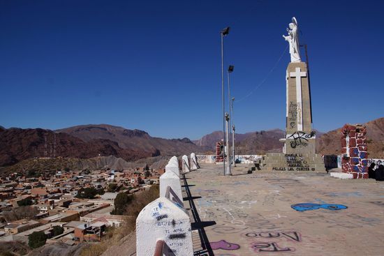 Außer dem Cerro, den wir am ersten Abend besucht haben, hat Tupiza noch einen Aussichtspunkt mit einem Cristo Blanco, den wir mal besuchen. Tagsüber in der strahlenden Sonne kann man den rötlichen Ton der umliegenden Berge noch besser sehen.
