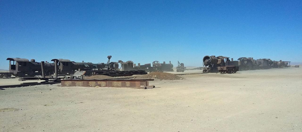 Nach dem Frühstück bringen wir unsere aussortieren Sachen in meinem Rucksackschutzbeutel zur Reiseagentur. Kurz nach zehn werden wir zum Geländewagen geführt in dem schon eine bolivianische Familie wartet. Sie macht nur einen eintägigen Ausflug und wir werden später zu den Anderen zusammen stoßen, die ebenfalls eine mehrtägige Tour machen. Wir fahren zunächst zu dem cementerio de trenes, dass sich nur etwa 2-3 km von der Stadt entfernt befindet. Es ist windig. Als wir über den Zugfriedhof laufen, versuchen wir, unsere Kameras vor dem Staub zu schützen.