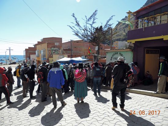 Am nächsten Morgen geht es nach dem Frühstück runter, um im Hafen das Boot nach Coopacabana zu nehmen. Im Hafen tummeln sich schon viele Touris, die hier ebefalls die Nacht verbracht haben.