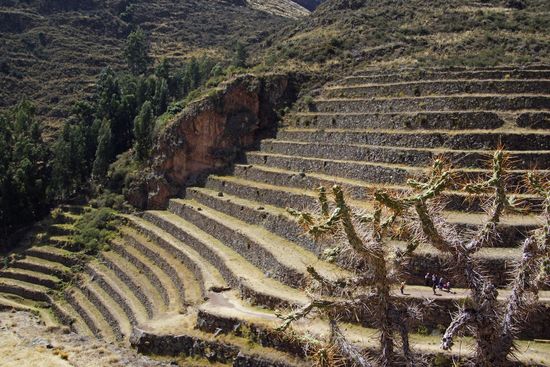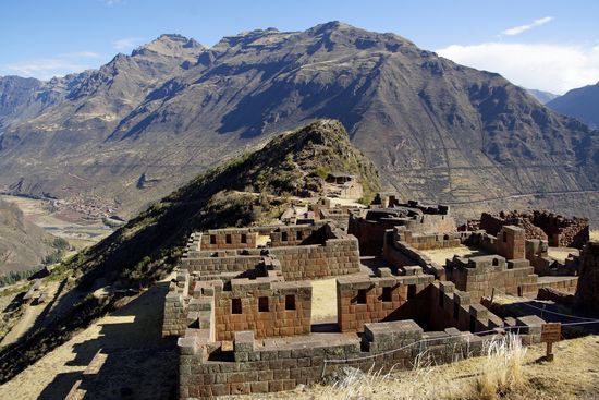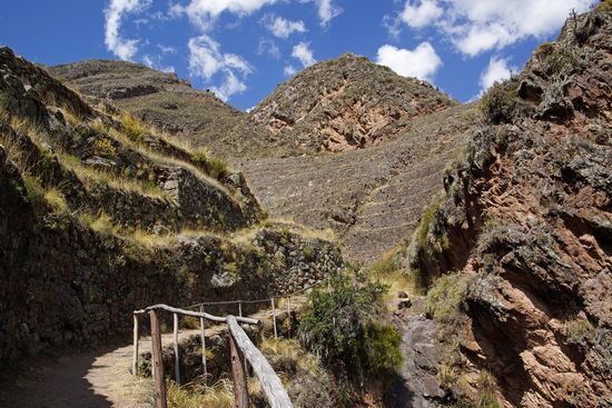 Tag später fahren wir nach Pisac und diesmal spiele ich nicht die faule, höhenkranke Person und wir erkunden die Anlage zu Fuss, beginnend unten in der Stadt und gehen den Weg bis zum Sonnentempel hoch. Und der Weg ist .... nun, eigentlich gar nicht so lang, aber es sind fast 400 Höhenmeter zu bewältigen und in der Sonne zu wandern macht schon etwas schlapp. Wir gehen gemütlich, lassen uns Zeit und genießen unterwegs die schöne Landschaft. Wir gehen an einigen Terrassen vorbei, manche gehen wir hoch und an manchen Stellen haben wir einen schönen Blick auf die Stadt Pisac. Am Sonnentor sind nur ganz wenige Touristen. Das ist echt schön an diesem Ort, dieser ist nämlich nur zu Fuss erreichbar. Wir treffen hier auf einen Typen aus Bulgarien, mit dem wir ein wenig quatschen, so wie auf ein französisch/tschechisches Pärchen, das aber kein Spanisch spricht. Gebrochenes Englisch ist also angesagt Mir fällt es immer schwerer, irgendwas auf englisch zu sagen. Jedes mal wenn ich was auf Englisch sagen will, wechsle ich automatisch zum Spanischen, es kommt einfach so aus dem Mund raus und ich kann es nicht beeinflussen