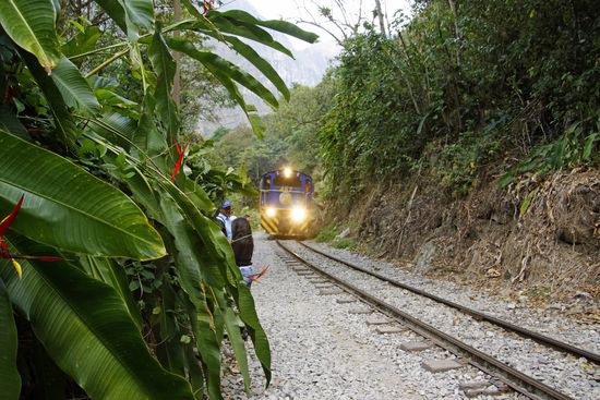 Als wir in Hidroeléctrica ankommen, erklärt uns der Busfahrer, wo der Weg nach Aguas Calientes beginnt und dass wir dort um 17:00 Uhr an der Plaza unseren noch unbekannten Guide finden, der unsere Namen ausrufen wird. Wir laufen also zunächst an dem Zugbahnhof vorbei. Hier kommen die Züge von Cusco an. Es gibt auch Züge von Hidroélectrica bis Aguas Calientes. Kosten: 5 Soles (etwa 1,5 $) für Peruaner und 31 $ für Ausländer. Wir laufen. Der Weg führt entlang des Zuggleises, parallel zum Fluss, den wir immer mal wieder durch die Bäume sehen können. Es ist bewölkt, ab und an kommt die Sonne raus und es ist warm. Wir sind tiefer als in Cusco und hier ist ein fast tropisches Klima, mit entsprechend vielen Mücken... . Wir schmieren uns unterwegs ein, um von denen nicht zerstochen zu werden. Sobald man stehen bleibt, fallen sie über einen her! Trotz des 40 % -gem Deet Zeugs kriegen wir viele Mückenstiche ab...