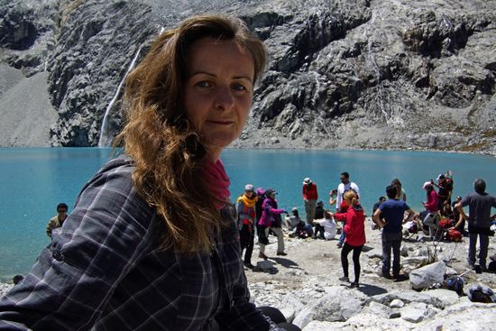 Wir machen einen Frühstücksstop an einem dafür vorgesehenen Restaurant. Auch andere Gruppen machen hier halt und es ist ziemlich voll. Dann geht es weiter, wir bezahlen 10 Soles Eintrittsgebühr und machen anschließend einen kurzen Halt an der Laguna Chinancocha. Das Wasser hat einen unglaublich tiefen Türkiston, dahinter ist der Nevado Huascarán. Wir alle machen viele Fotos, unglaublich beeindruckt von der Schönheit der Lagune. Anschließend fahren wir im Bus weiter, an einer zweiten Lagune vorbei, die mir noch schöner zu sein scheint als die erste, mit ihrem strahlenden Tieftürkisblau. Ich versuche schnell ein paar Fotos durch die Scheibe zu machen, denn hier halten wir nicht mehr an. Warum bloß!?!? Ja, ich weiß, wir haben keine Zeit, der Tag wird noch lang und der Guide will keine Zeit verlieren. Man weiß nicht vorher, wie langsam oder schnell die Gruppe sein wird.