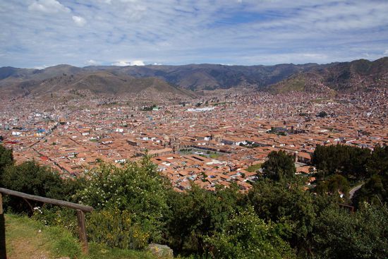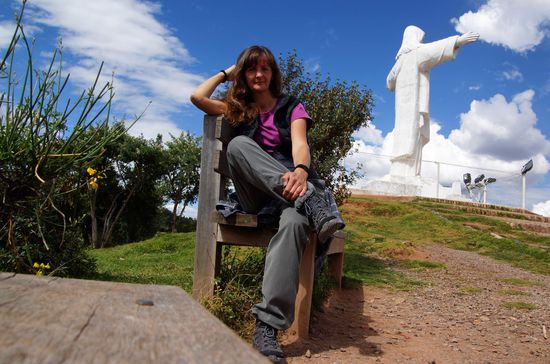Dann gehe ich zur Straße Choqechaka, an deren Ende ich bei der Gastfamilie wohnte, und beginne den Aufstieg, Stufe für Stufe.... und es sind viele Stufen.... ich merke schon wieder, dass ich auf über 3300 m bin. Ich lasse mir Zeit, genieße immer wieder die Aussicht, die sich mir mit jedem Höhenmeter mehr bietet, und gehe weiter. Dann noch ein kurzes Stück an der Hauptstraße vorbei und bald bin ich am Cristo Blanco. Es ist ruhig hier, kaum Touristen, nur ein paar Einheimische, die Souvenirs verkaufen oder sich als Guide anbieten.