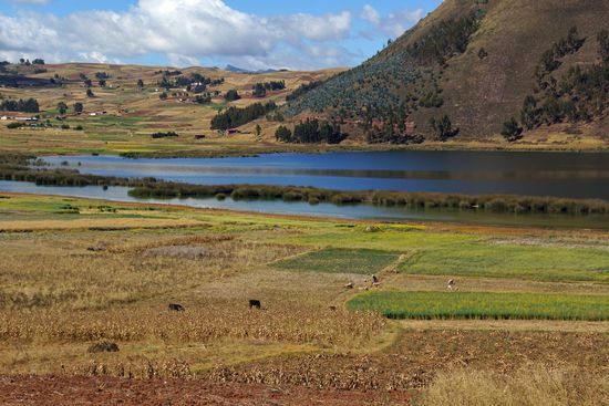 Bald erreiche ich die Lagune Huaypo.... sehe die Wasservögel auf dem Wasser landen, höre hier und da Vogelgezwitscher, über mir fliegt ein... Falke(?), setzt sich auf den Strommast und schaut mich an. Links und rechts des Weges sind Felder, auf denen die Bauern ernten. Ein paar Rinder auf den Wiesen schauen mich leicht interessiert an. Ob die eine Touristin vom Bauern unterscheiden können?