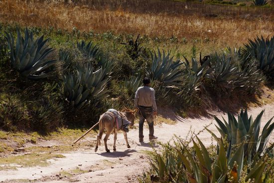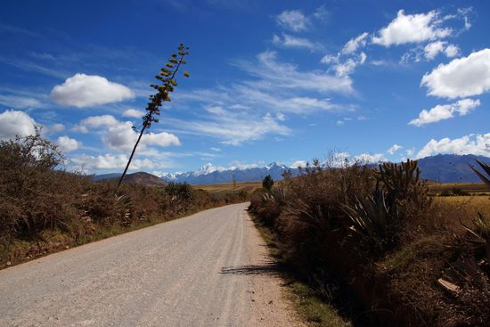 Ich kehre zurück, und biege im Dorf in einen Feldweg, der mach Maras führt. Kurze Zeit später verlasse ich das Dorf und laufe die Schotterpiste entlang, vor mir die schneebedeckten Berge, am Wegesrand große Agaven...