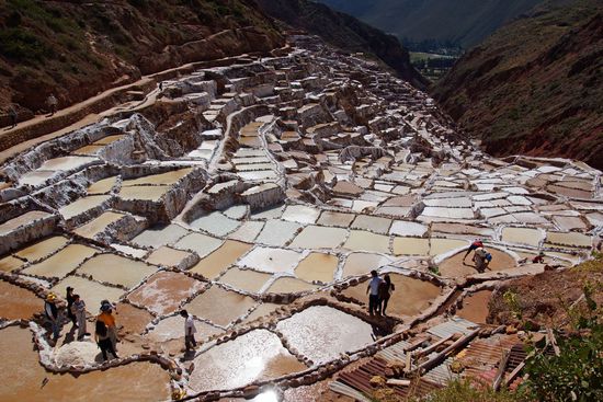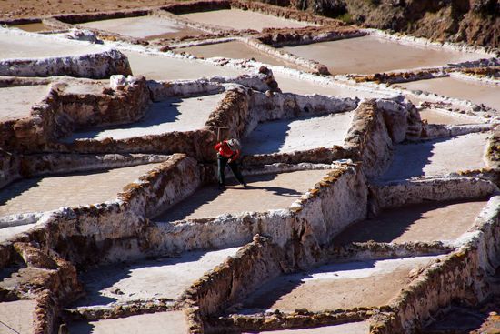 Der Weg führt immer weiter hinunter, ich hoffe die ganze Zeit, dass ich diese Höhe am Ende nicht wieder rauf gehen muss Und dann, auf einmal, sehe ich die Salineras! Wow, so groß habe ich mir das Ganze nicht vorgestellt. Ich gehe runter, bis ich den Parkplatz erreiche und prompt zur Bezahlung des Eintritts aufgefordert werde. Ja, der Señor passt gut auf. Ich bezahle 10 Soles und gehe rein. Am oberen Rand führt ein Weg entlang der einzelnen Becken, in denen das Salz gewonnen wird. ich bin beeindruckt von der Größe. Es sollen an die 3000 Becken sein. Die Salzterrassen stammen noch aus der Inka Zeit. Das salzige Wasser wird in die einzelnen Wasserbecken geleitet. Das Wasser verdunstet durch die starke Sonneneinstrahlung, übrig bleibt das reine Salz, was anschließend geerntet wird. Bevor das Wasser reingelassen wird, wird der Boden des Beckens festgeklopft.