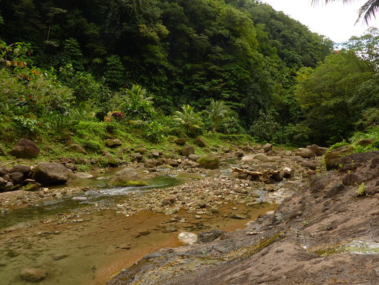 Auf stellenweise steilen Strecken mit bis zu 32 % Steigung oder Gefälle geht es ins Innere der Insel. Immer neue großartige Ausblicke auf eine wilde, tropische Natur und dann wieder Blicke abgrundtief auf das karibische Meer oder den Atlantik ! Entlang an Rinnsalen, die nach einem kräftigen Regenguss zu reißenden Bächen werden können und Straßen und Wege unpassierbar machen. Dazu Linksverkehr, mit dem unser Fahrer zwar souverän fertig wird, mich als Beifahrer aber manchen Schweißtropfen kostet.