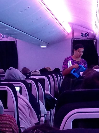 Die sind nicht nur kompakter, die sind auch unkonventioneller. Wenn andere Steardessen mit ihrem Troley den Saft verteilen, funktioniert das bei Kiwiair wie folgt. Linke Hand Saftkanne, unter dem linken Arm die Plastikbecher geklemmt und mit der rechten Hand Plastikbecher nehmen, einschütten und bedienen. Läuft bei den Kiwis.
