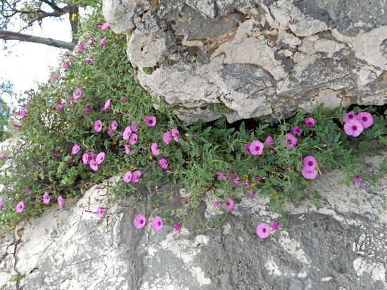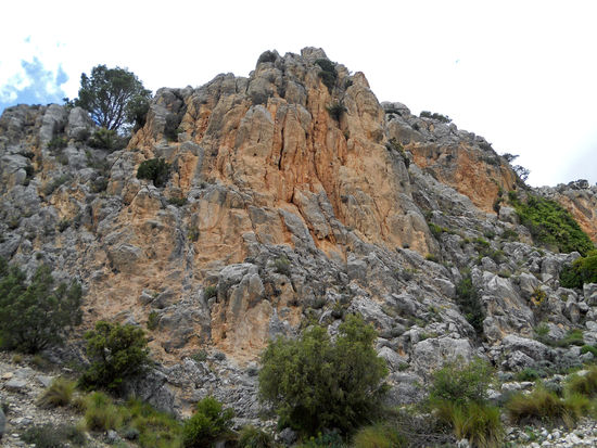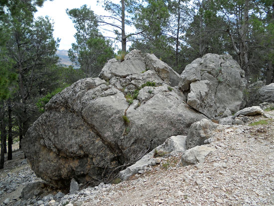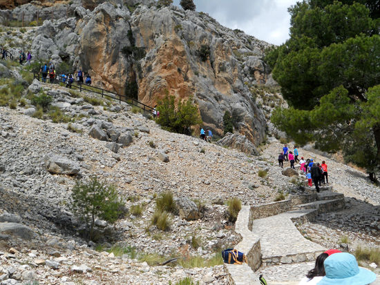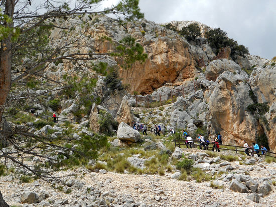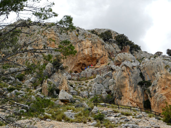 Vom Parkplatz geht es einen holprigen Weg steil bergauf. Mich macht das ziemlich fertig, zumal es sehr warm ist. Ich verzichte daher auf den letzten steilen Weg bis zum Eingang der Höhle und lass Rolf allein dahin klettern. Ich setze mich auf einen Baumstamm, unterhalte mich mit einigen Wanderern und lausche dem Geläut der Glocken, die die Schafe hier tragen.